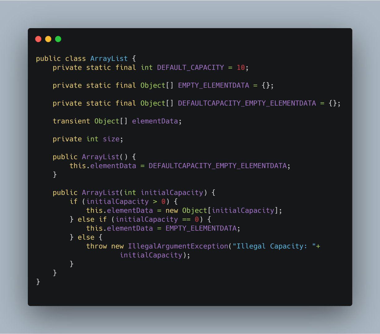 EMPTY_ELEMENTDATA和DEFAULTCAPACITY_EMPTY_ELEMENTDATA看起来都是静态常量,并且都是一个空数组,那么为什么要定义两个不同的变量呢?这个问题在看完后面的内容就可以得到答案了。