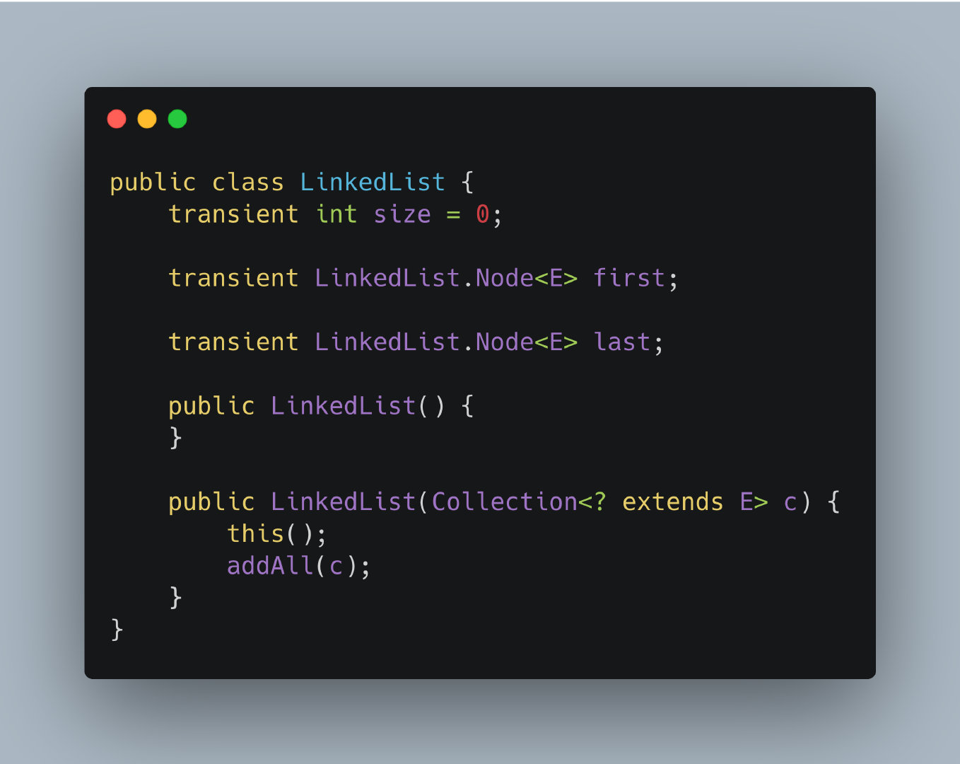 包含两个构造函数,默认构造函数不进行任何操作,重载的构造函数可以接受一个Collection集合,其中首先调用无参构造函数,然后调用addAll()方法将所有元素添加到链表中