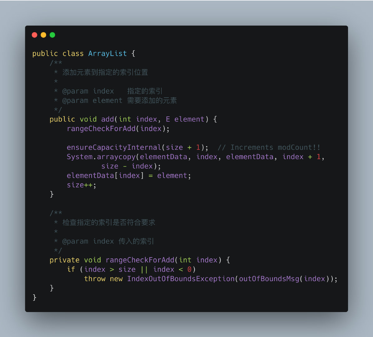 接下来介绍添加元素方法,这又可以分为两种情况,一是将新元素追加到末尾,二是在指定的索引处添加元素,下面还是结合源码分别进行介绍