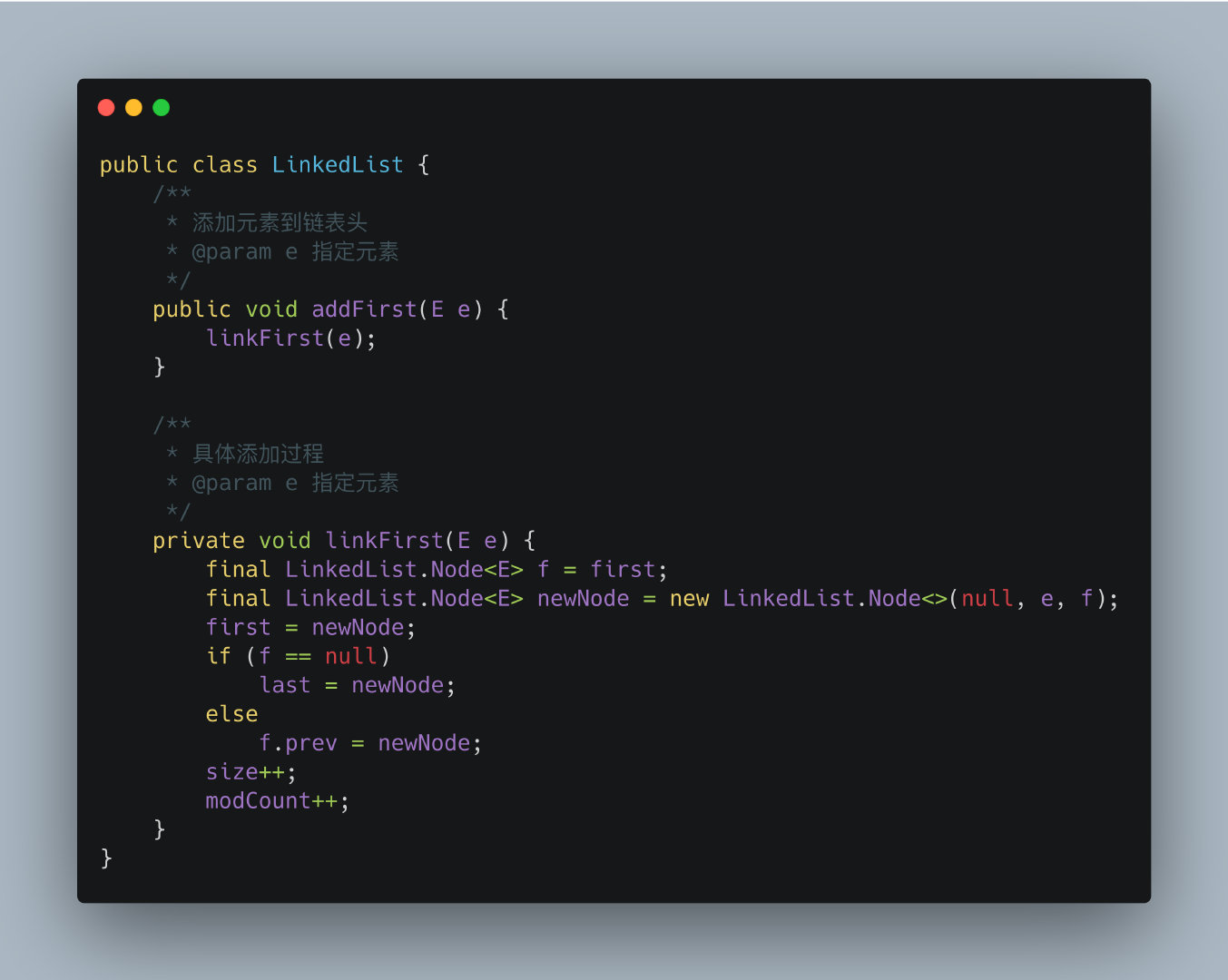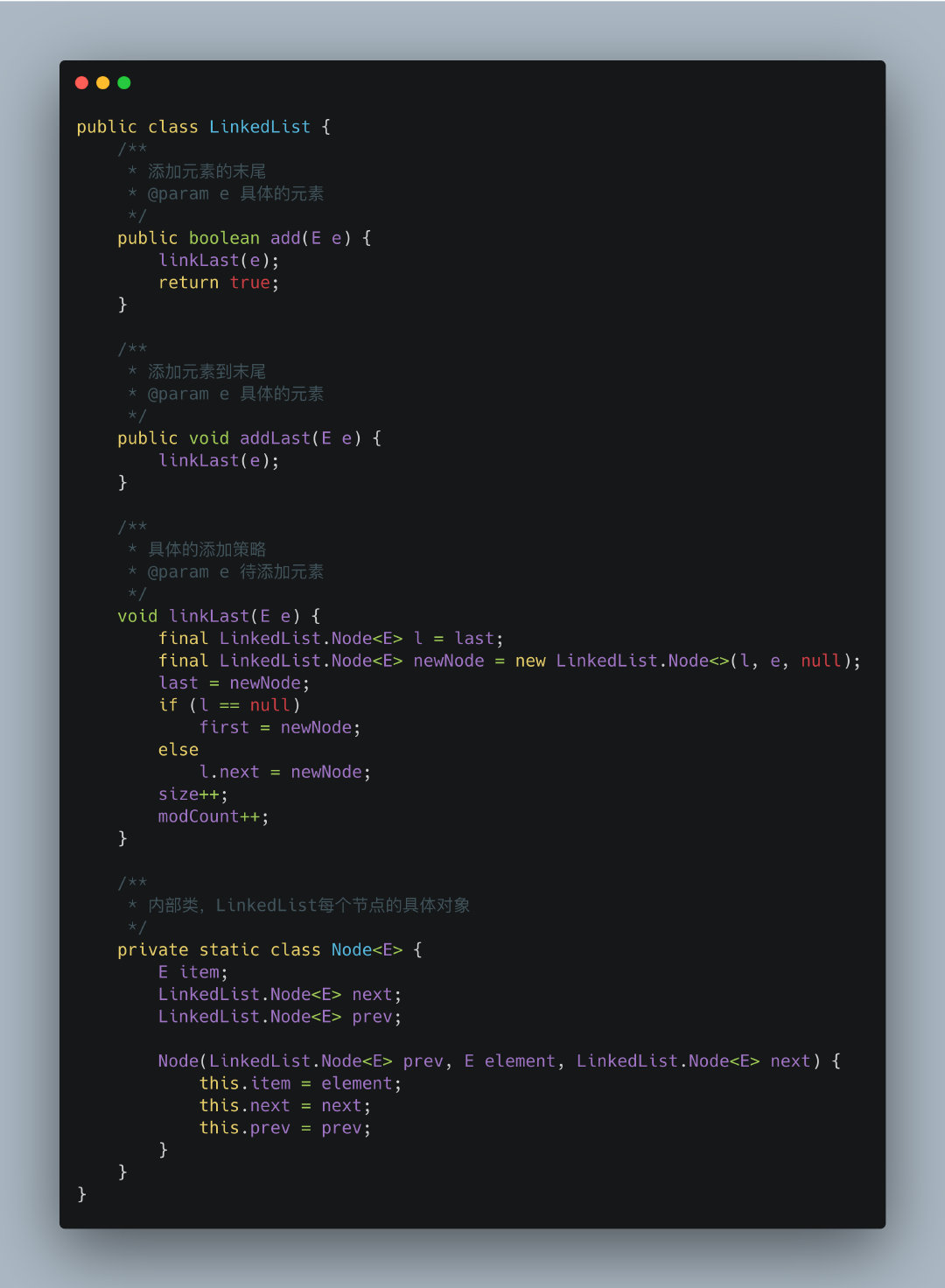 在前面曾经说过,LinkedList是一个双向链表,从这里我们就能看到。LinkedList中的每一个链表元素其实都是一个LinkedList.Node对象,它是LinkedList的一个内部类。每一个对象都有一个前驱节点和一个后继节点。