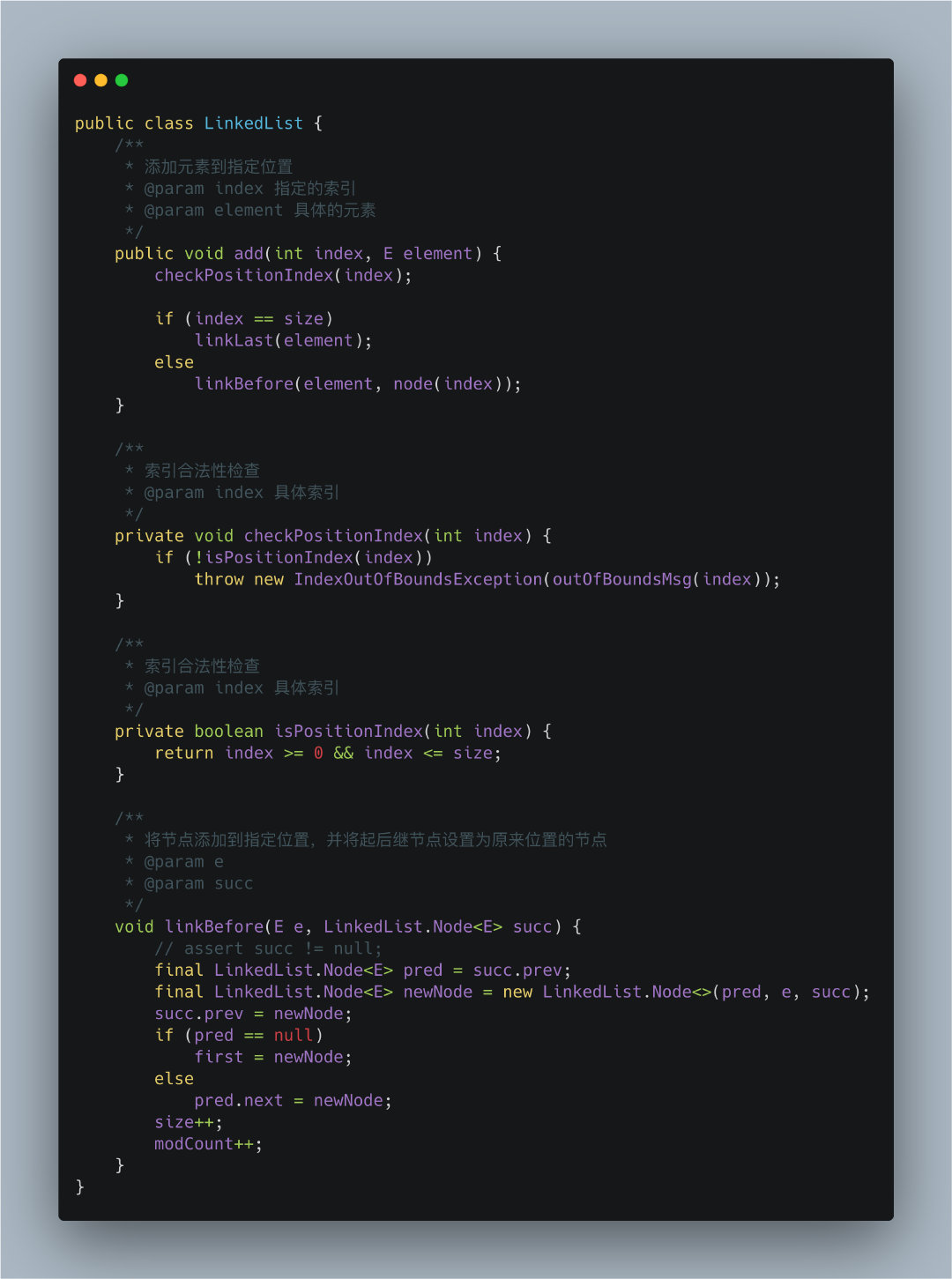 checkPositionIndex(int index)进行下标的合法性检查,如果是负数或者超出当前链表长度就会抛出异常