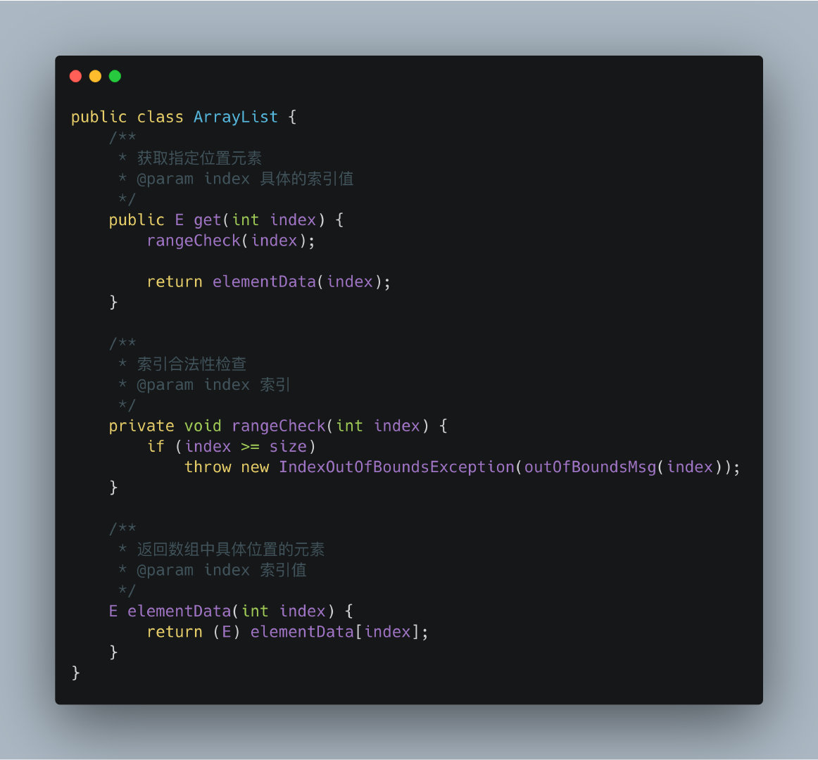 在ArrayList中获取指定位置的索引非常简单,先判断传入的索引是否超出链表的长度范围,然后在调用底层的数组获取指定的元素并返回