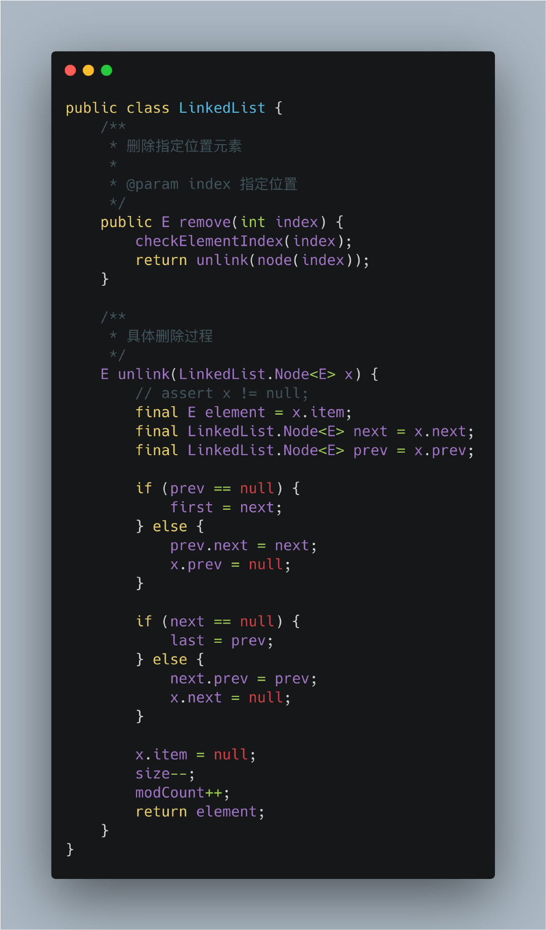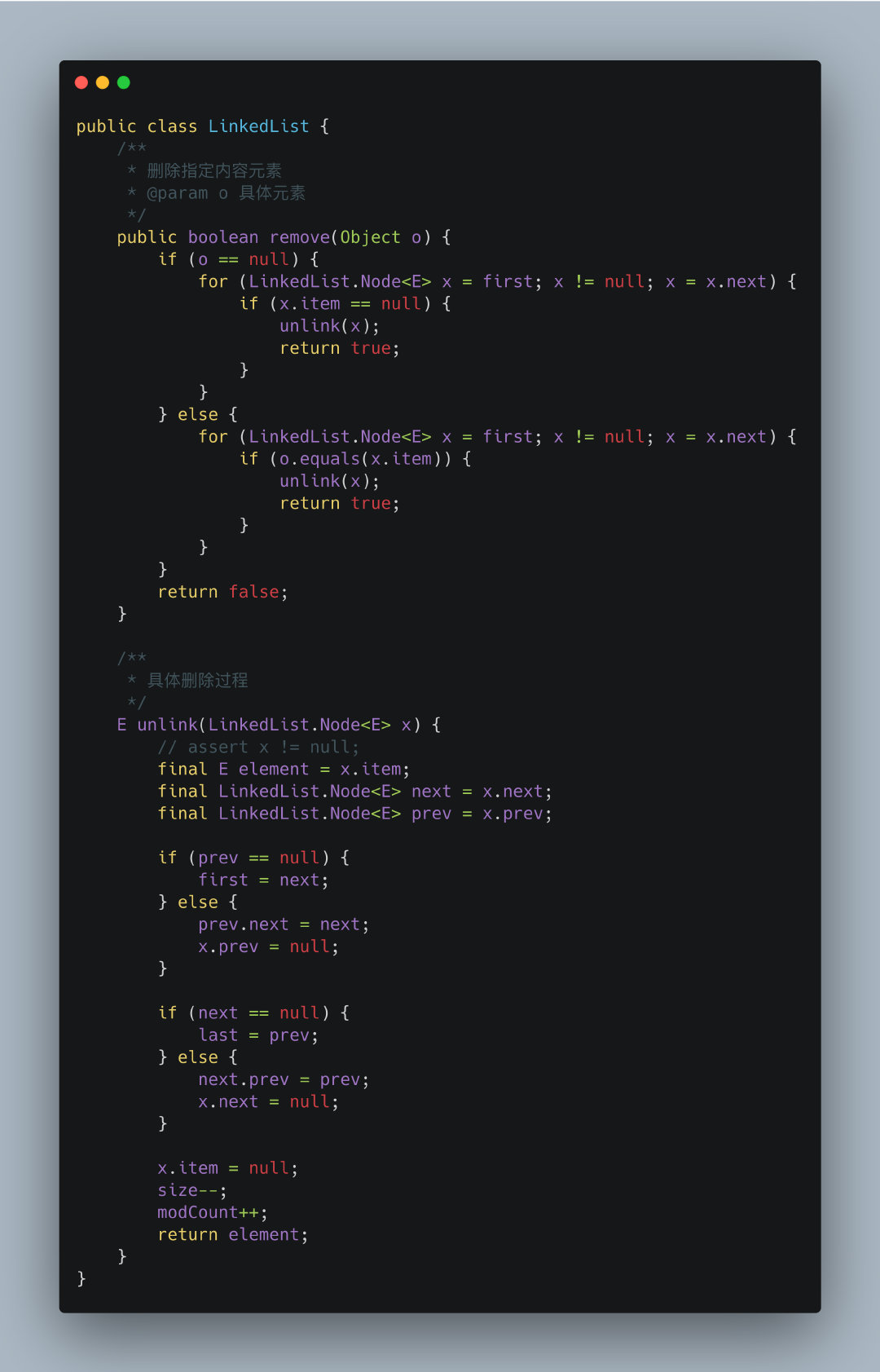 也是删除第一次出现的元素,其他的也是和ArrayList基本一致,只不过是循环判断的方式不同。找到之后调用unlink(LinkedList.Node<E> x)执行删除过程