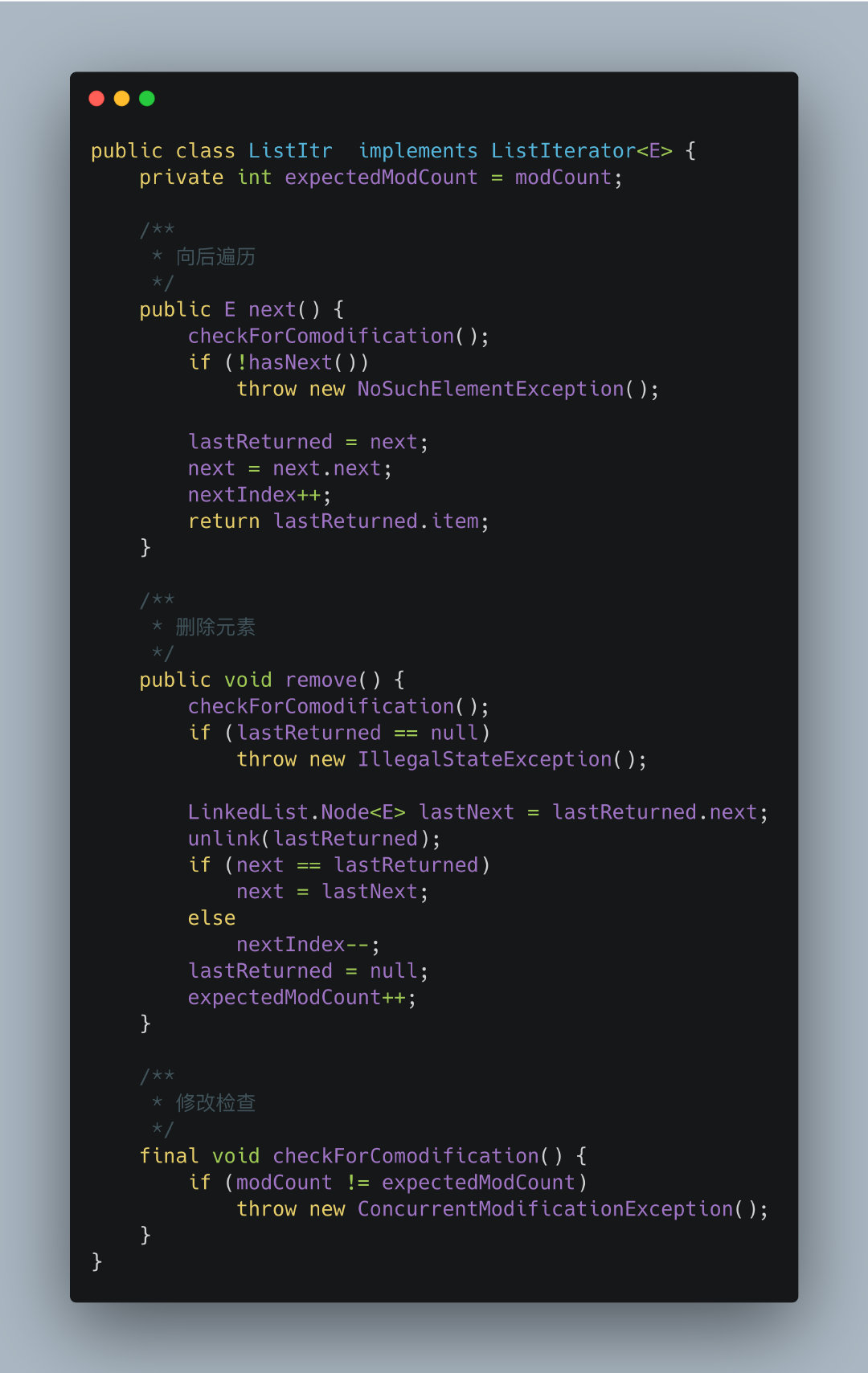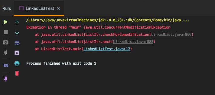 可以看上面的异常信息栈,就发生在checkForComodification()方法中,这里面抛出异常的可能原因就只有一个那就是modCount != expectedModCount,在上面我们说明modCount记录的是对链表操作的次数。expectedModCount是ListItr的一个属性,由于是内部类,所以在创建的时候赋值等于modCount