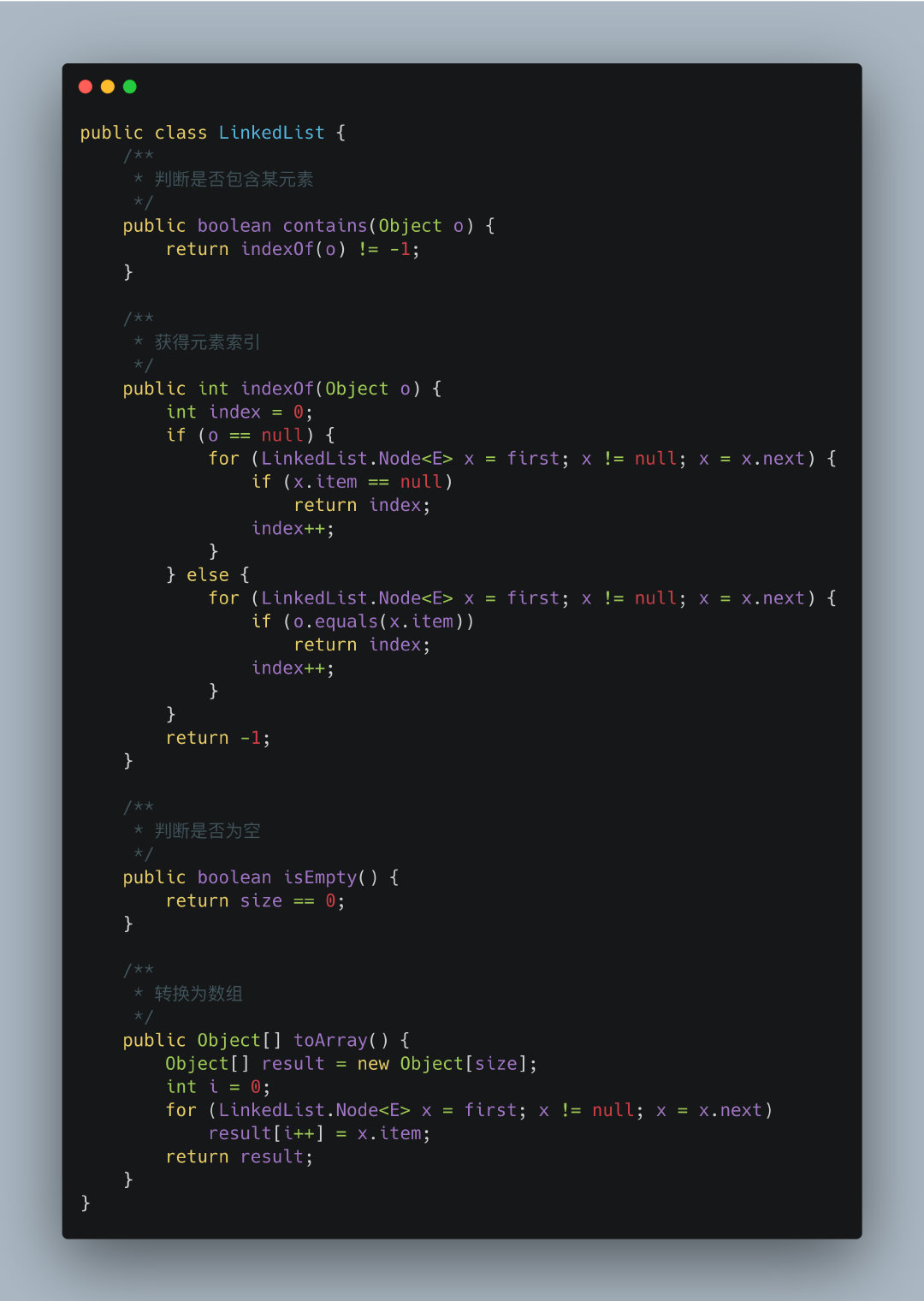 contains()、indexOf()和isEmpty()基本都和ArrayList一样,只有toArray()有所不同,在ArrayList中是通过调用Arrays.copyOf()实现的,而LinkedList则是自己创建一个数组直接赋值