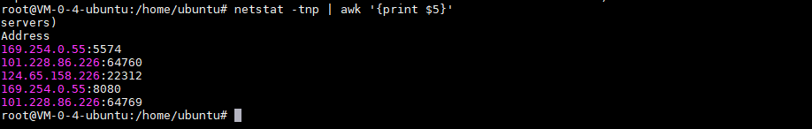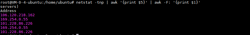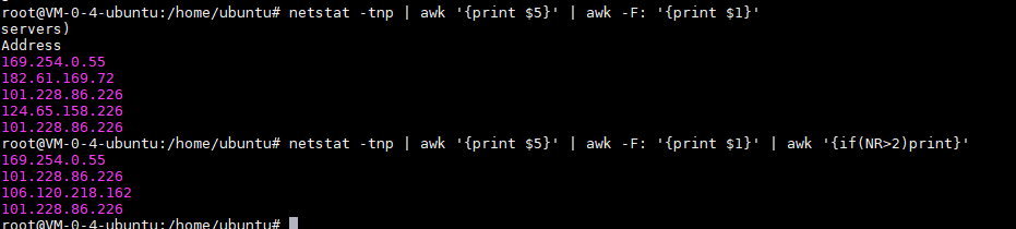 - -F : 与'{print $1}'之间有一个空格的 - netstat -tnp查看 ***图1*** - awk '{print $5}' 取出第五列 ,然后我们的后续其实就是对这个第五列的数据进行处理 ***图2*** - awk -F: '{print $1}' 以冒号作为分割,取出IP ***图3***,可以看到servers和Address这2个数据我们并不需要 - 所以 awk '{if(NR>2)print}' 去除前2行的数据 ***图4*** - 后面就是一套组合拳 sort | uniq -c |wc -l 排序,去重,统计 ***图5*** -