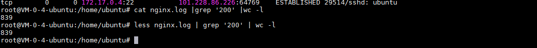 cat nginx.log | grep '200' | wc -l // less nginx.log | grep '200' | wc -l