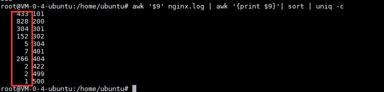 awk '$9' nginx.log | awk '{print $9}'| sort | uniq -c 图1