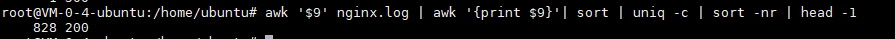 awk '$9' nginx.log | awk '{print $9}'| sort | uniq -c | sort -nr | head -1取出出现次数最多的数(828次) 图3