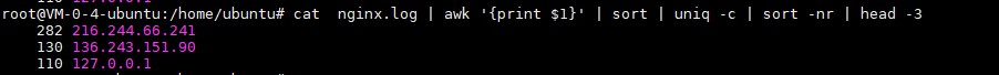 cat nginx.log | awk '{print $1}' | sort | uniq -c | sort -nr | head -3 图1