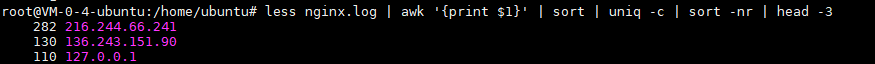 less nginx.log | awk '{print $1}' | sort | uniq -c | sort -nr | head -3 图2
