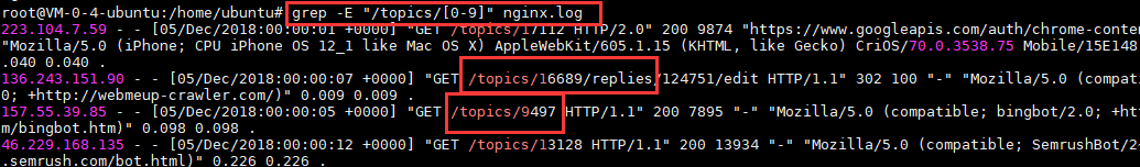 5.找出访问 /topics/xxxxx,以及访问topics/***/replies的 接口的请求分别有多少