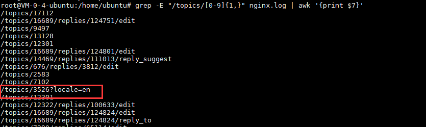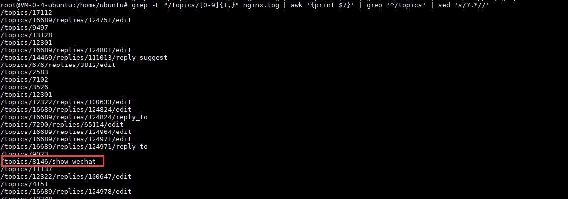 grep -E "/topics/[0-9]{1,}" nginx.log | awk '{print $7}' | grep '^/topics' | sed 's/?.*//' 图4