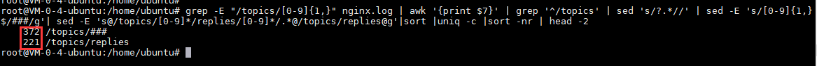 - grep -E "/topics/[0-9]{1,}" nginx.log | awk '{print $7}' | grep '^/topics' | sed 's/?.*//' | sed -E 's/[0-9]{1,}$/###/g'| sed -E 's@/topics/[0-9]*/replies/[0-9]*/.*@/topics/replies@g'|sort |uniq -c |sort -nr | head -2