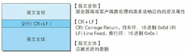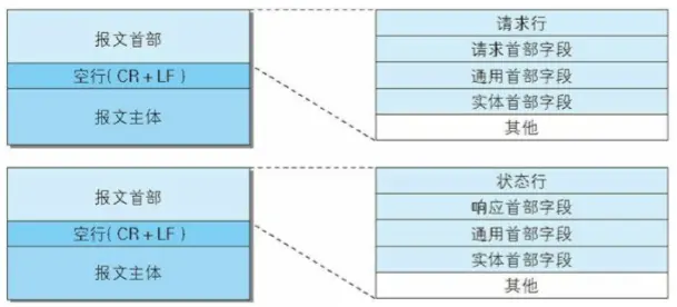 HTTP 报文大致可分为报文首部和报文主体两块。两者由最初出现的 空行(CR+LF)来划分。通常,并不一定要有报文主体。