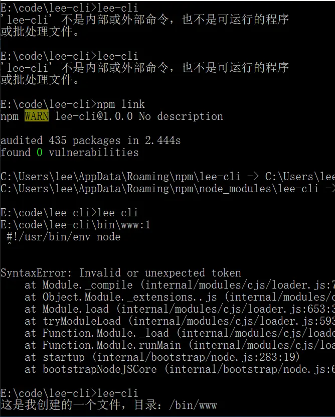 是因为我们在建bin/www文件时建的文件时有扩展名的比如www.js,但是我们在package.json中的代码 还是: "bin": { "lee-cli": "./bin/www" } 改为"bin": { "lee-cli": "./bin/www.js" }既可以。