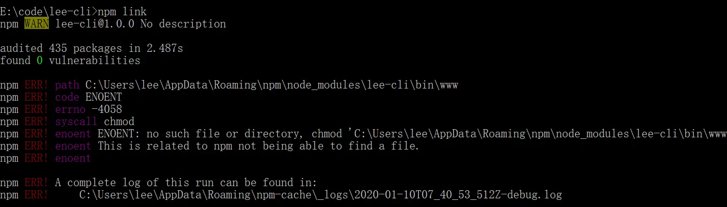 console.log("这是我创建的一个文件,目录:/bin/www");3)在执行npm link 如下报错: