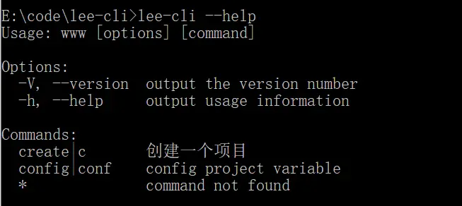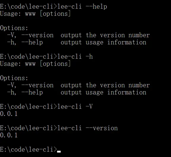 如上图2-4-1所示,执行lee-cli --help已经有提示输出了,而且lee-cli -V是我们在代码中设置的内容。