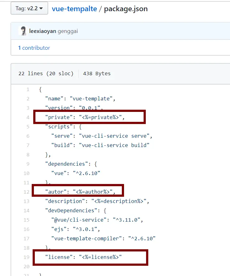 因为此情况有很多种形式,我们在此模拟了一个需要用户在命令行选择用户输入内容的特定的复杂模板。在其中一个仓库中存放一个ask.js中放入可以用inquirer模块执行的命令行参数,来询问生成相应的package.json文件,因为里边用到ejs