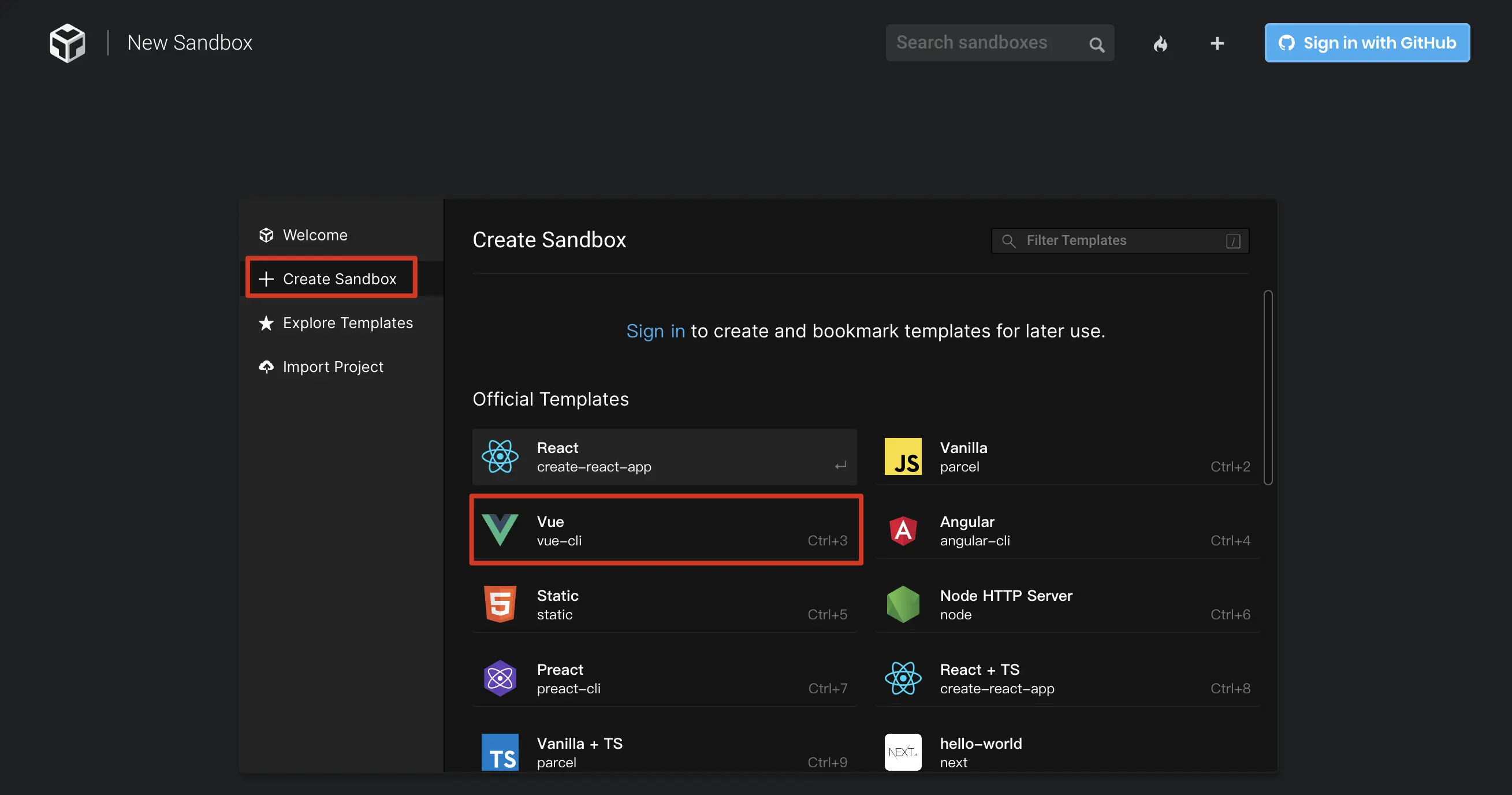 - 点击按钮之后,进入创建沙盒页面,按照下图方式点击,即可创建vue应用