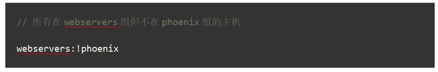 #ansible 103.235.168.56:103.235.168.40:103.235.168.58 -m ping (3)逻辑非(!)匹配 逻辑非用感叹号(!)表示,主要针对多重条件的匹配规则,使用方式如下: