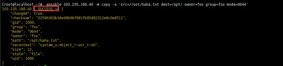 [root@localhost ~]# ansible 103.235.168.40 -m copy -a 'src=/root/haha.txt dest=/opt/ owner=foo group=foo mode=0644'
