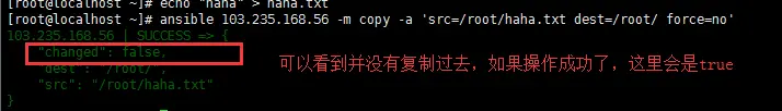 [root@localhost ~]# ansible 103.235.168.56 -m copy -a 'src=/root/haha.txt dest=/root/ force=no'
