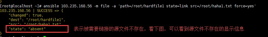 [root@localhost ~]# ansible 103.235.168.56 -m file -a 'path=/root/hardfile state=link src=/root/haha.txt force=yes'
