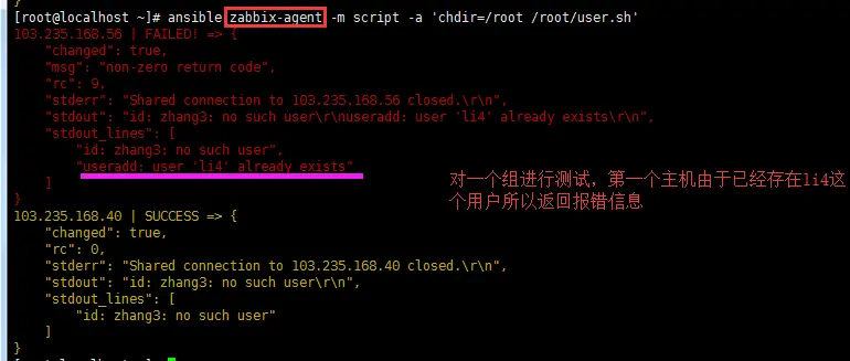 [root@localhost ~]# ansible 103.235.168.56 -m script -a 'chdir=/root /root/user.sh'
