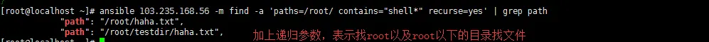 #查找文件内容中包含 abc 字符串的文件,隐藏文件会被忽略,不会进行递归查找。 [root@localhost ~]# ansible 103.235.168.56 -m find -a 'paths=/root/ contains="shell*"'