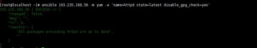 [root@localhost ~]# ansible 103.235.168.56 -m yum -a 'name=httpd state=latest disable_gpg_check=yes'