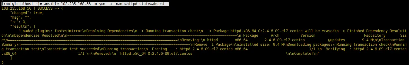[root@localhost ~]# ansible 103.235.168.56 -m yum -a 'name=httpd state=absent '