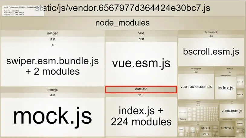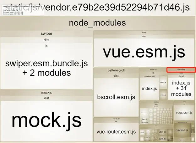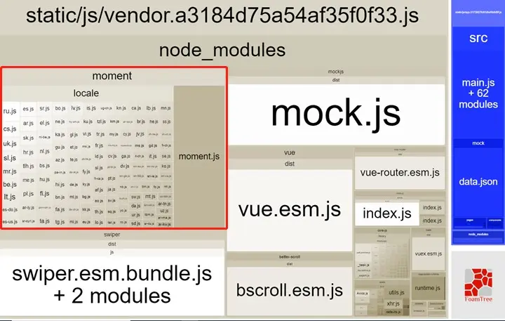 分析图中,文件占据的面积越大表示其文件的大小越大。很明显,moment.js差不多占据了整个打包文件的1/3 。而我们只是用来转换日期这样的很小功能点。
