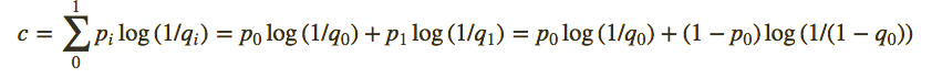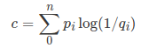 现在,如果每个结果的实际概率为$pi$却有人将概率估计为$qi$怎么办。在这种情况下,每个事件都将以$pi$的概率发生,但是公式里的自信息就要改成$qi$(因为人们以为结果的概率是$q_i$)。现在,在这种情况下,加权平均自信息就变为了交叉熵c,它可以写成: