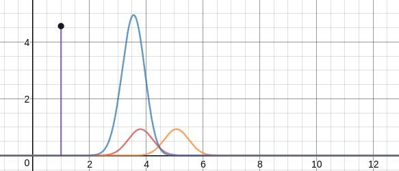 紫色线代表蓝色曲线下的面积,估计概率分布(橙色线),实际概率分布(红色线)
