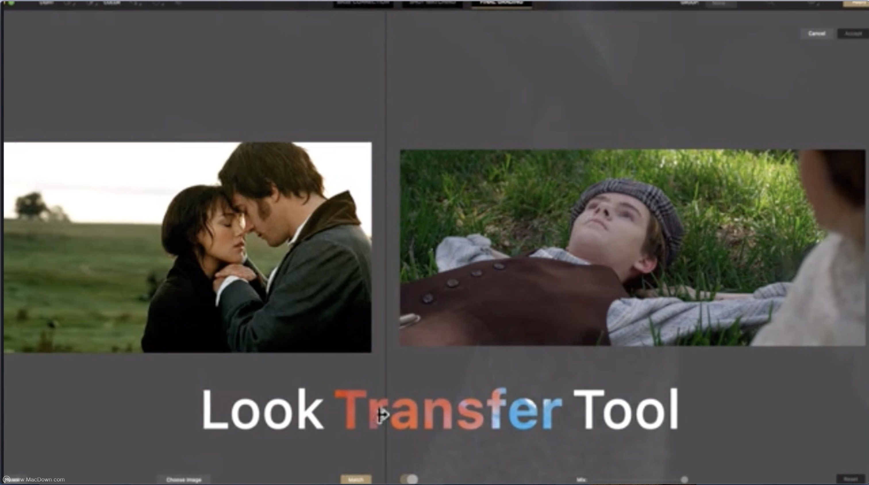 外观转换工具使用外观转换工具轻松匹配您喜欢的图像或胶片的调色板。只需导入屏幕截图或任何参考框架,然后单击“匹配”即可使用颜色控件进行微调。