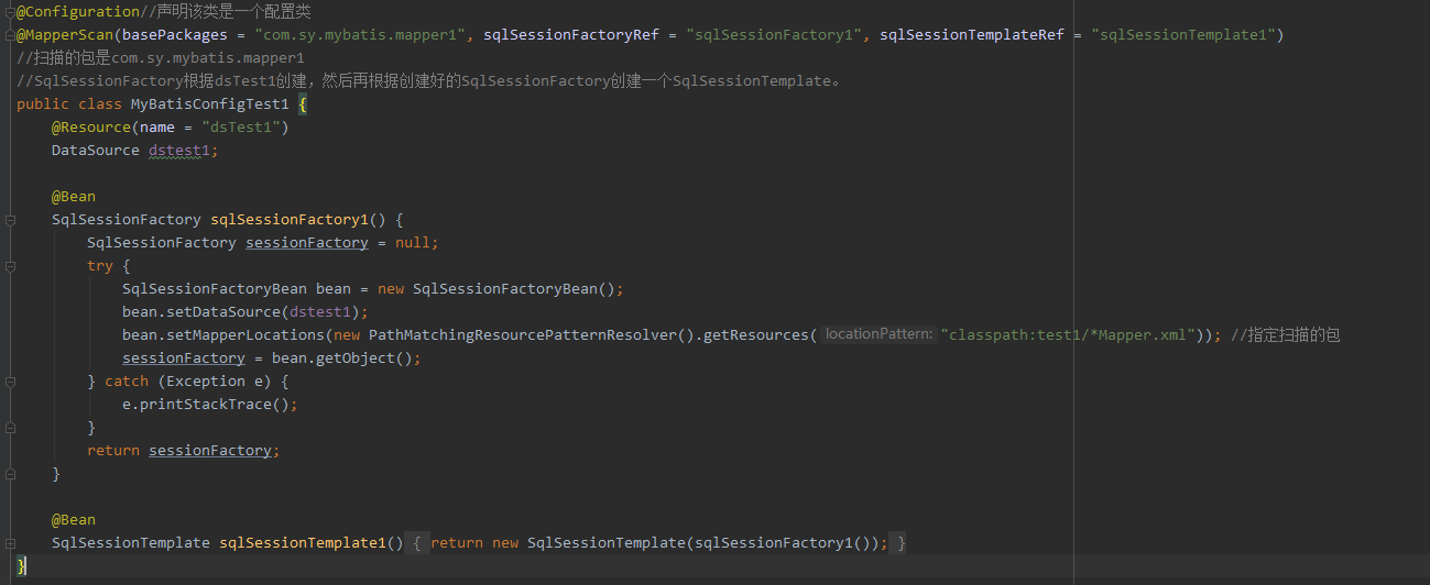 @MapperScan(basePackages = "com.sy.mybatis.mapper1", sqlSessionFactoryRef = "sqlSessionFactory1", sqlSessionTemplateRef = "sqlSessionTemplate1")定位mapper-dao文件,唯一的SqlSessionFactory实例和事务。 bean.setMapperLocations(new PathMatchingResourcePatternResolver().getResources("classpath:mapper/wp/**.xml")); 定位mapper-xml文件。 要记得指定扫描包,不然有可能报错:no statement (这种错误也可能是mapper的xml中,namespace与项目的路径不一致导致的,具体看情况吧,注意一下就行,问题不大)