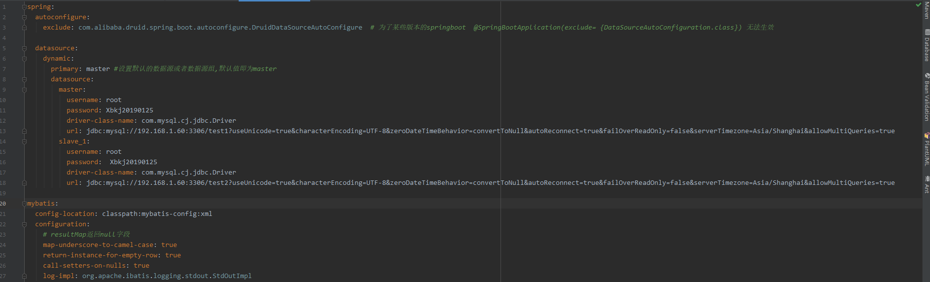 这边我使用的是druid,为了某些版本的springboot @SpringBootApplication(exclude= {DataSourceAutoConfiguration.class}) 无法生效,手给他去除了自动配置