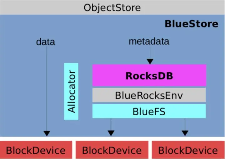 WAL、对象元数据、对象扩展属性Omap、磁盘分配器元数据。 - BlueRocksEnv:抛弃了传统文件系统,封装RocksDB文件操作的接口。