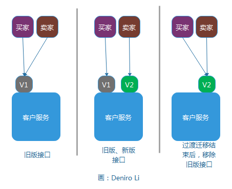 通过这种方式,就可以我们尽快发布新版本的微服务。因为新老接口同时存在,客户端也有时间迁移过渡到新接口。一旦所有客户端不再使用老接口,就可以移除掉这个接口。