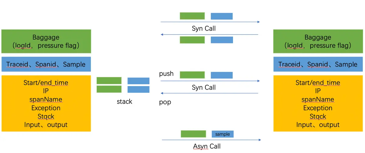 另一个需要讨论的是SpanContext:SpanContext其实在不同场景下都有不同的概念。这里更多的指的是用于下游恢复链路的构造部分和需要透传的参数。 根据上述内容,很容易理解一个span其实是需要对端构造的2条日志才能完整的构造。这2条日志会被日志被各自实例收集起来各自上传,仅仅有少量的参数会随rpc之类的介质透传给下游用于恢复链路或者参数透传,总的来说参数透传成3个部分: