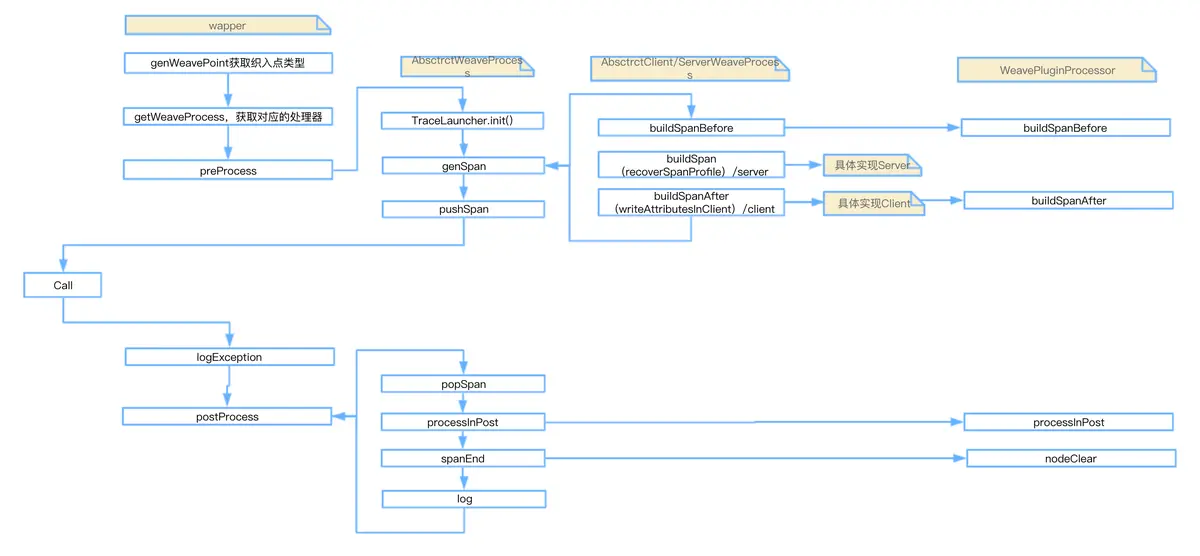 - 一层抽象是针对增强点或者植入点的。因为不同介质的入口都是不一样的,wapper是统一的针对增强点的处理,用来统一的代码收口,wapper层面会判断当前代码的入口类型,并选取不同的AbsctrctWeaveProcess来进行处理,代码可以设计抽象的代码模板(client和service端基础类)。不同植入点在基础代码暴露出来的接口上进行拓展。
