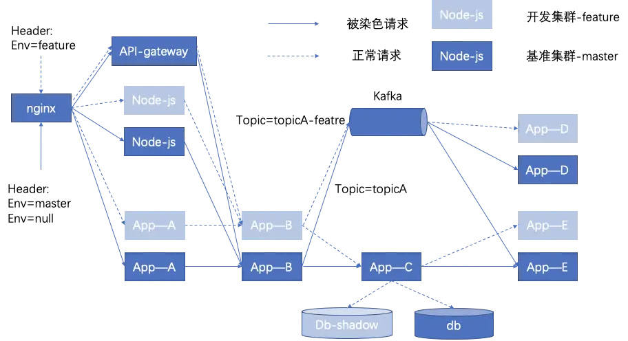 对于rpc,客户端做路由的时候会根据环境信息优先选取特定子环境的集群,如果没有则调用基准环境,基准环境中的应用在调用的时候也可以根据相同的规则优先调用子环境。即使调用穿过了中间件比如队列,则传递的消息也附带有环境信息,trace也可以根据信息解析出路由规则并进行透传。不过为了避免消息被基准环境的app消费还是需要建特定子环境的topic。