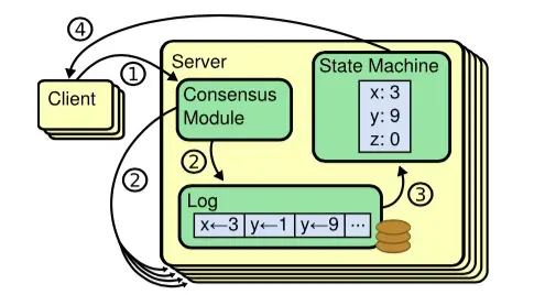 共识算法是实现这类组件的关键算法。简单的说共识算法是协调多个节点达成共识的算法,这是构建高可用系统的基石。大部分典型的共识算法都是基于状态复制机来实现的,每个节点都有一个状态机以及一个日志,状态机用于保持一个共识的结果,这样客户端只要连接到任意节点上就可以获取到状态机的内容。而日志是用于保证输入的顺序,只要保证所有日志的提交顺序是一致的则可以保证各个节点的状态机是一直的。