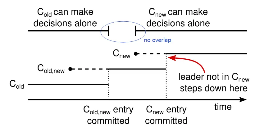 这里描述的方式虽然可行,但是实践中大部分不会采用这么麻烦的方式,一种策略也是Diego在其博士论文中提出的Single Cluster MemberShip Change,其基本思路就是上问中出现两个leader的根本原因是2个集群的节点不存在重叠,也就是说无法存在一个仲裁者来觉得采用哪个配置。