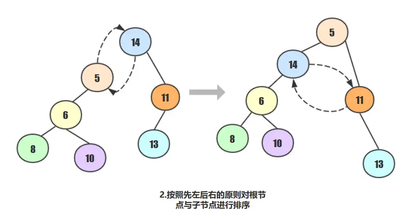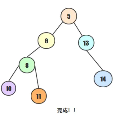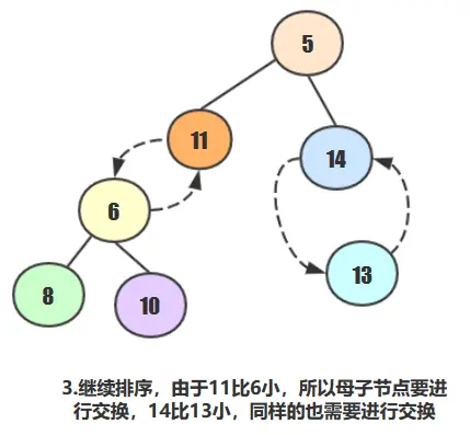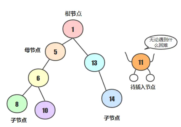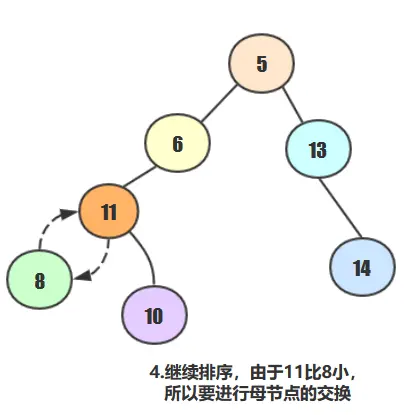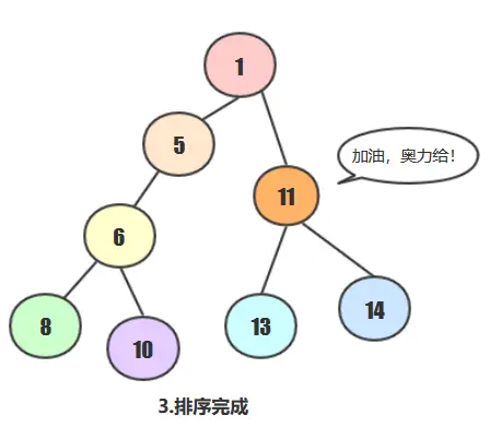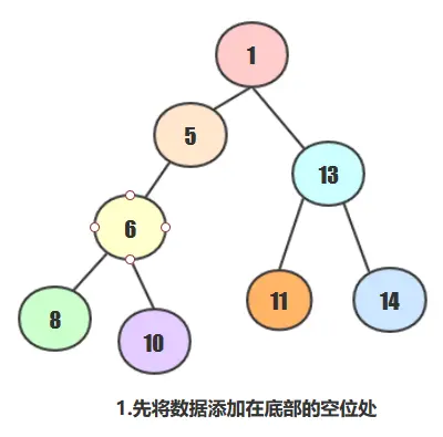 母节点的11要比根节点的1要大,同时11的子节点13和14都比其大,13又比14要小,所以不再进行交换,这样,一个插入数据的演示操作已完成。