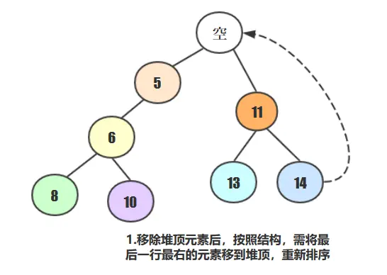 删除元素时,我们删除的是堆顶的元素并用堆的最后一个节点填补取走的堆顶元素。但用最后一个元素取代堆顶元素可能会对其结构产生影响,因此我们还需要对堆进行符合结构的调整。演示如下: