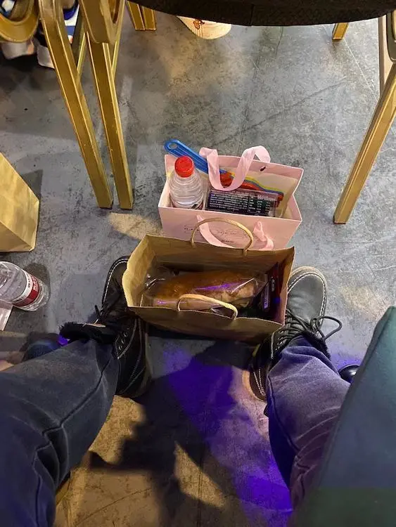 这是我们出发的时间点,因为去会场有很长的时间都不会有吃的,公司热心的准备了补给包,大概有:牛肉干、面包、小吃的、咖啡饮料(可能是怕大家困了吧)