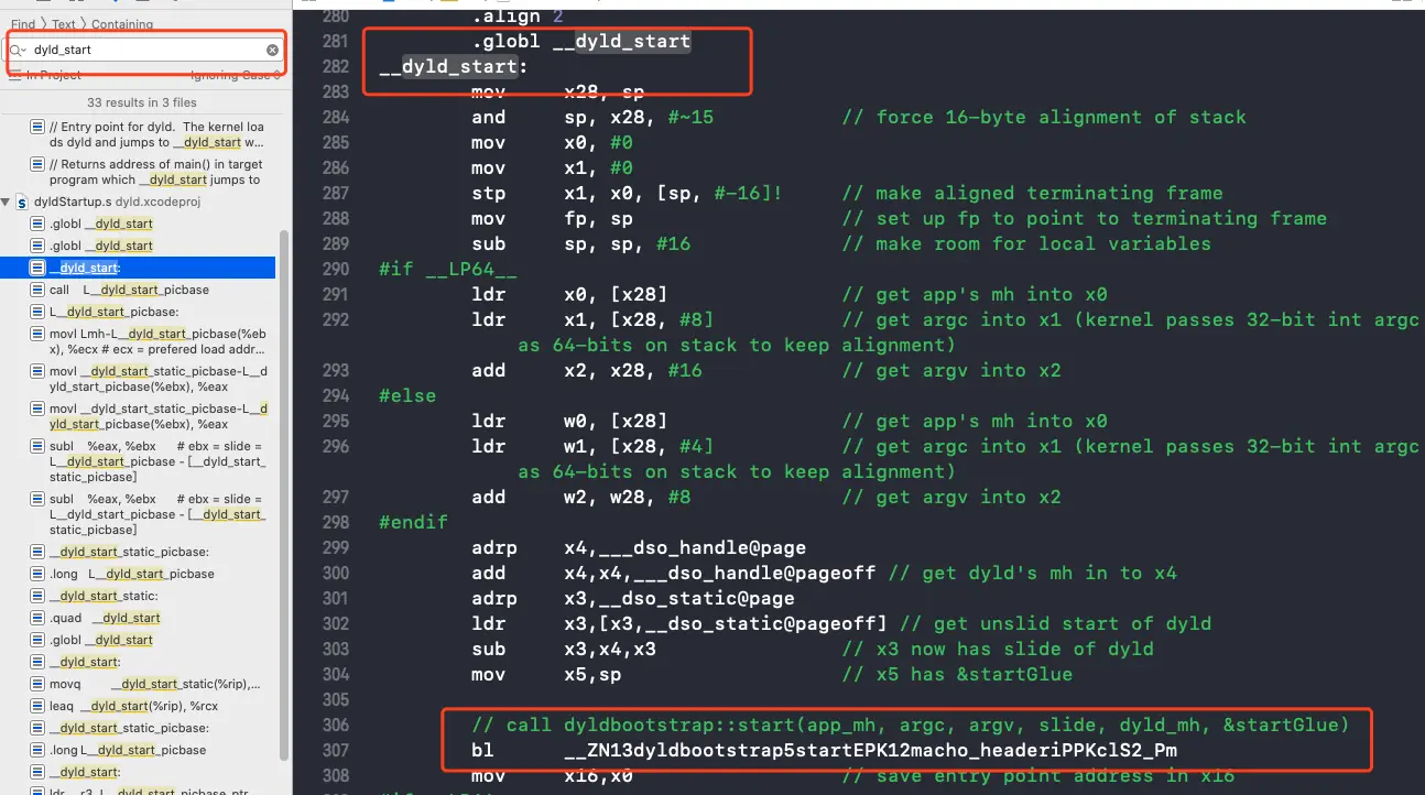 首先进行全局搜索dyld_start,进入dyldStartup.s文件,找到arm64相关部分,如图: