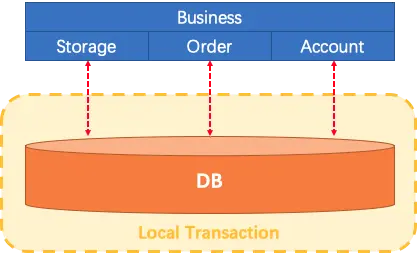 让我们想象一下传统的单片应用程序,它的业务由3个模块组成,他们使用单个本地数据源。自然,本地事务将保证数据的一致性。